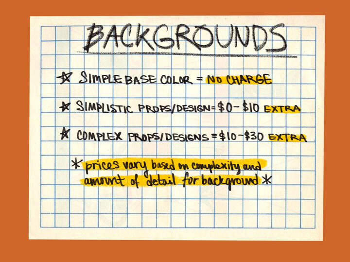 Furries—I promise I have absolutely nothing against the furry community I’m just not very confident in my ability to draw anthropomorphic animals in the specific furry art style and I feel that it would be unfair of me to charge someone for a bad piece. Hopefully one day I’ll get to a level where I will be confident enough in my abilities to include furry art for commission (Additions of tails, ears, wings, or other small animalistic physical traits to a humanoid figure is fine.)
